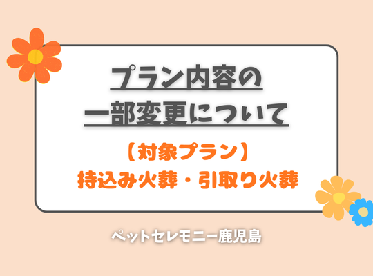 2025/12/30こんにちは、ペットセレモニー鹿児島です 弊社でご用意をしている4つのプランのうち「持込み火葬」「引取り火葬」のプラン内容を一部変更させて頂くこととなり... -